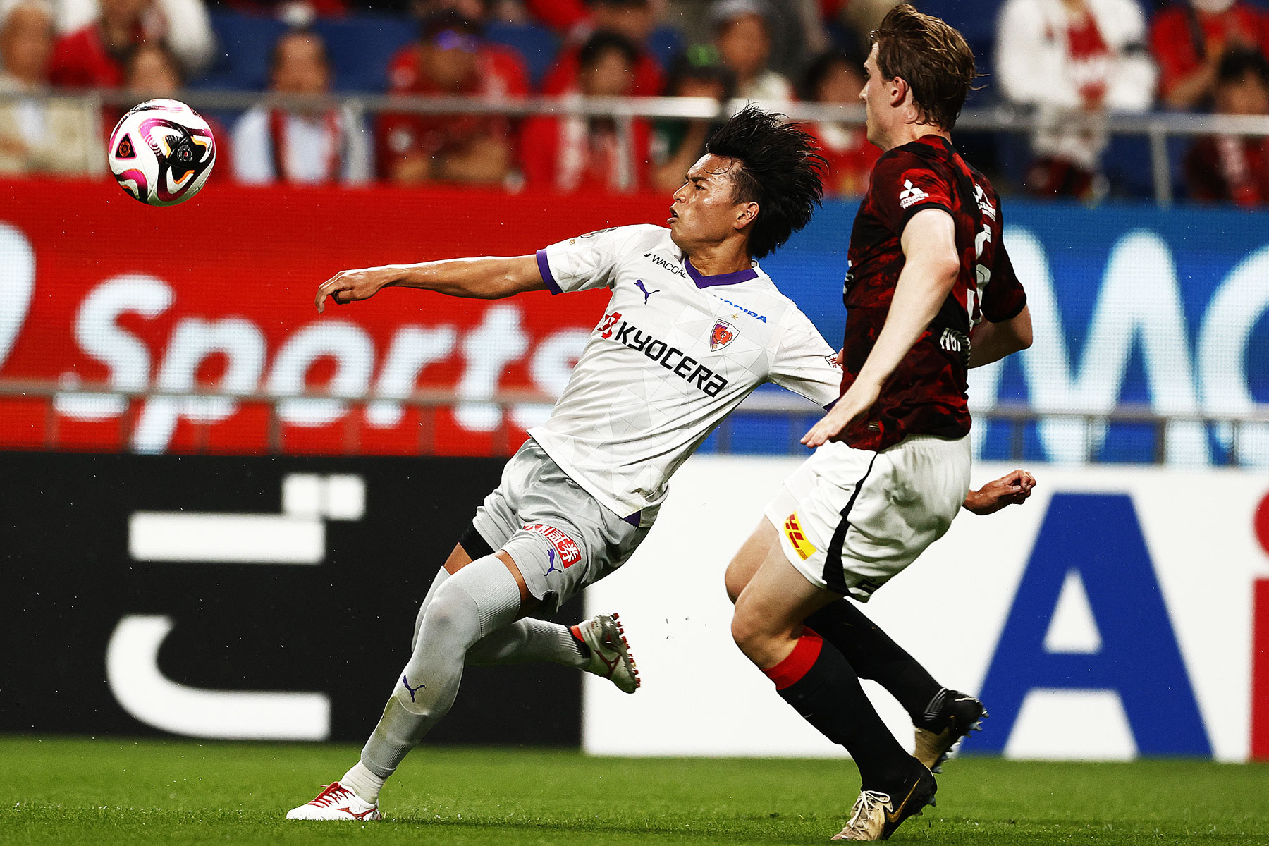 平日のナイトゲームで雨の試合にもかかわらず、京都からもたくさんのサポーターに来てもらいましたし、浦和レッズのスタジアムに満員って感じではなかったと思いますけども、本当にたくさんのお客さんが赤色のユニフォームを着てレッズをサポートしてる姿で、本当にこのスタジアムはやりにくいなっていう風なこと感じました。とは言っても、前半から レッズさんの特徴を出させないように、自分たちの特徴が出せるように勇敢に相手に対して向かっていったつもりですけど、やはり最後のところで自分たちの勇気がなくて、シュートを足を振って外すというよりは、やり切れなくて最後終わってしまうような場面があったことで、 彼らの決定力に火をつけてしまったな、そういう風なゲームになってしまったと思います。