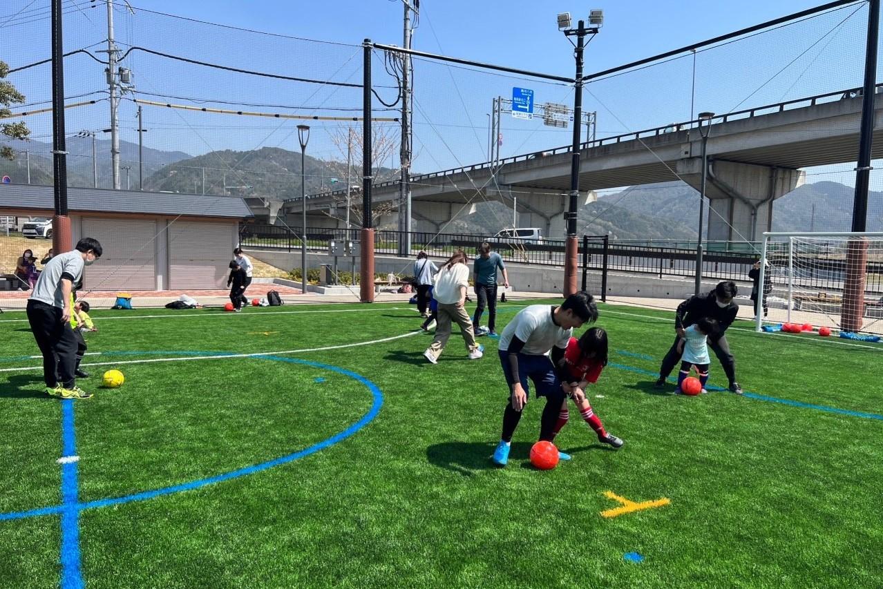 4/1(土)開催「明治安田生命J1リーグ第6節ヴィッセル神戸戦(14:00キックオフ@サンガスタジアム by KYOCERA)」の試合前に、サンガスタジアム by KYOCERAの横に完成した、かめきたスポーツパークで「エンジョイサッカー教室&親子サッカー教室」を実施しました。