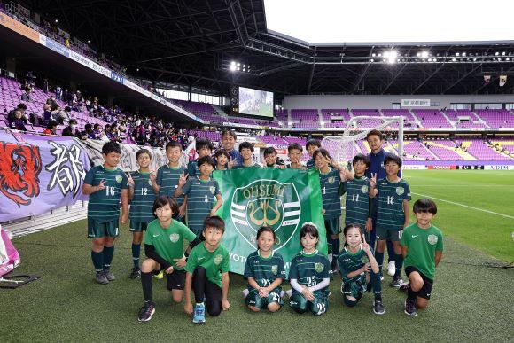 ホームタウンで活躍する子どもたちが試合前にピッチを行進しました。今回は京田辺市から「京都田辺FCスポーツ少年団」、「京都南・大住サッカースポーツ少年団」、京丹後市から「大宮サッカー少年団」、「なでしこtango」、「京丹後峰山FC」、「網野サッカークラブ」に行進していただきました。
