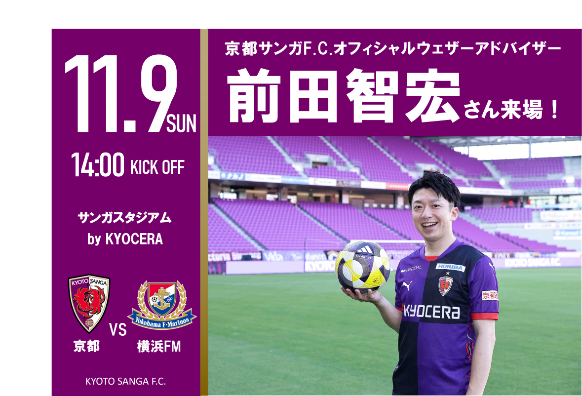 11/9(日)に開催される横浜F・マリノス戦において、『京都サンガF.C.オフィシャルウェザーアドバイザー』の前田智宏さんのご来場が決定しました!