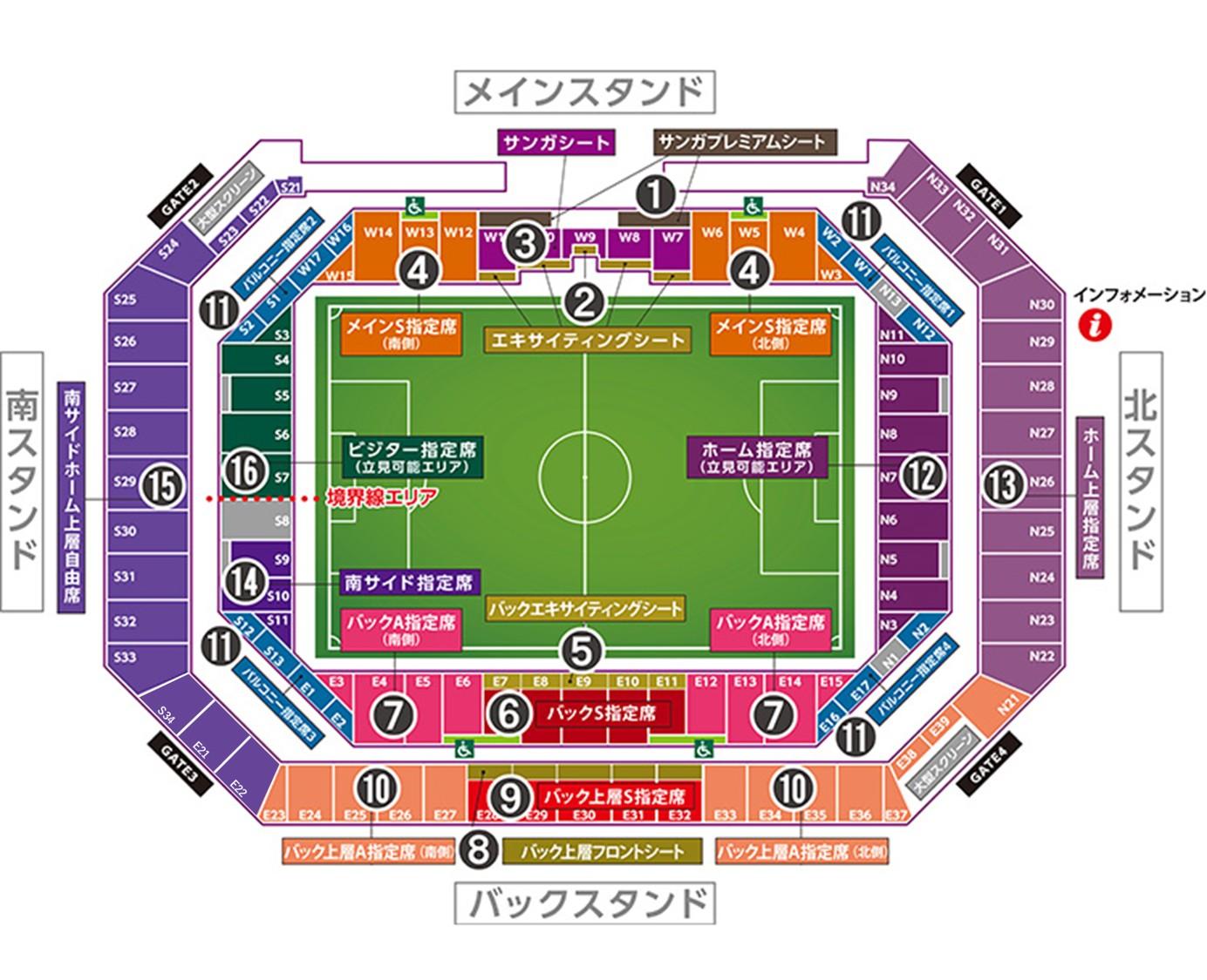 | ミックスエリア(ホーム・ビジター混在) | メインS指定席(南側) バックA指定席(南側) バック上層フロントシート バック上層S指定席 バック上層A指定席(南側) バルコニー指定席2・3 南サイド指定席 |