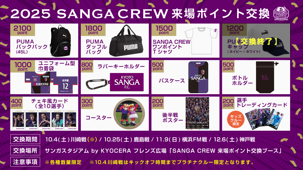 ・キックオフまでは事前申請制となります。キックオフ後は事前申請なしで交換いただけます。事前申込フォームは、対象試合の当週に公開の「SANGA CREW(ファンクラブ)情報」のニュースページ内に設置いたします。