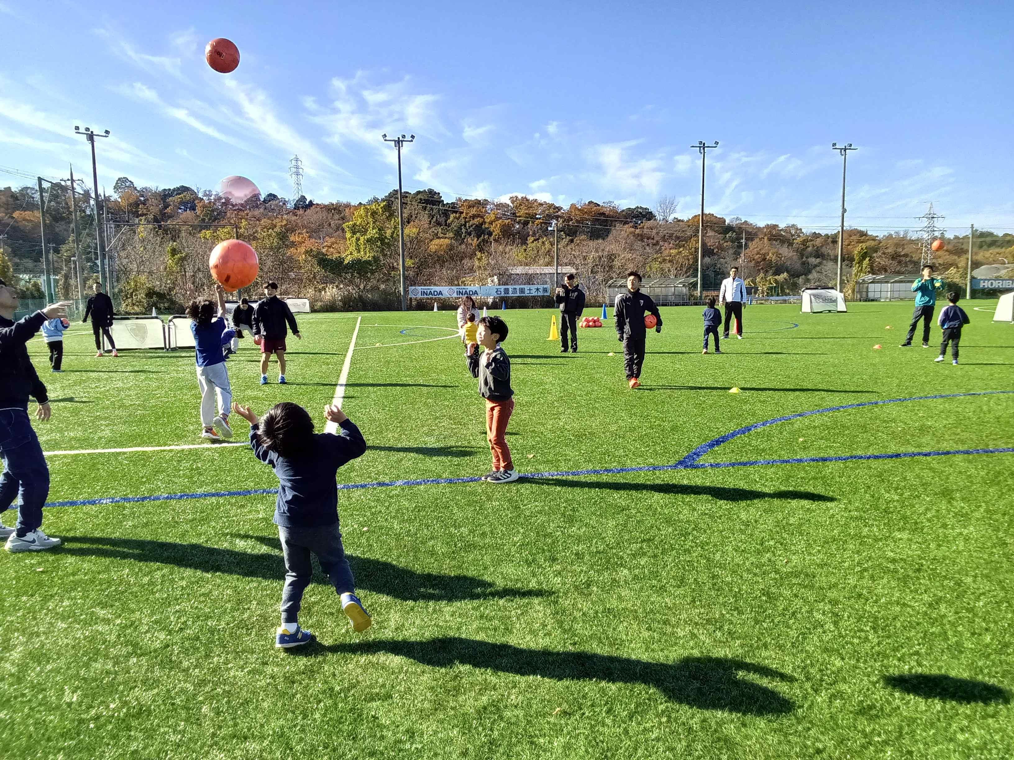 サンガスクールコーチによる親子サッカー教室が開催され、幼児から小学生(低学年)が親子で和気あいあいとサッカーを楽しみました。