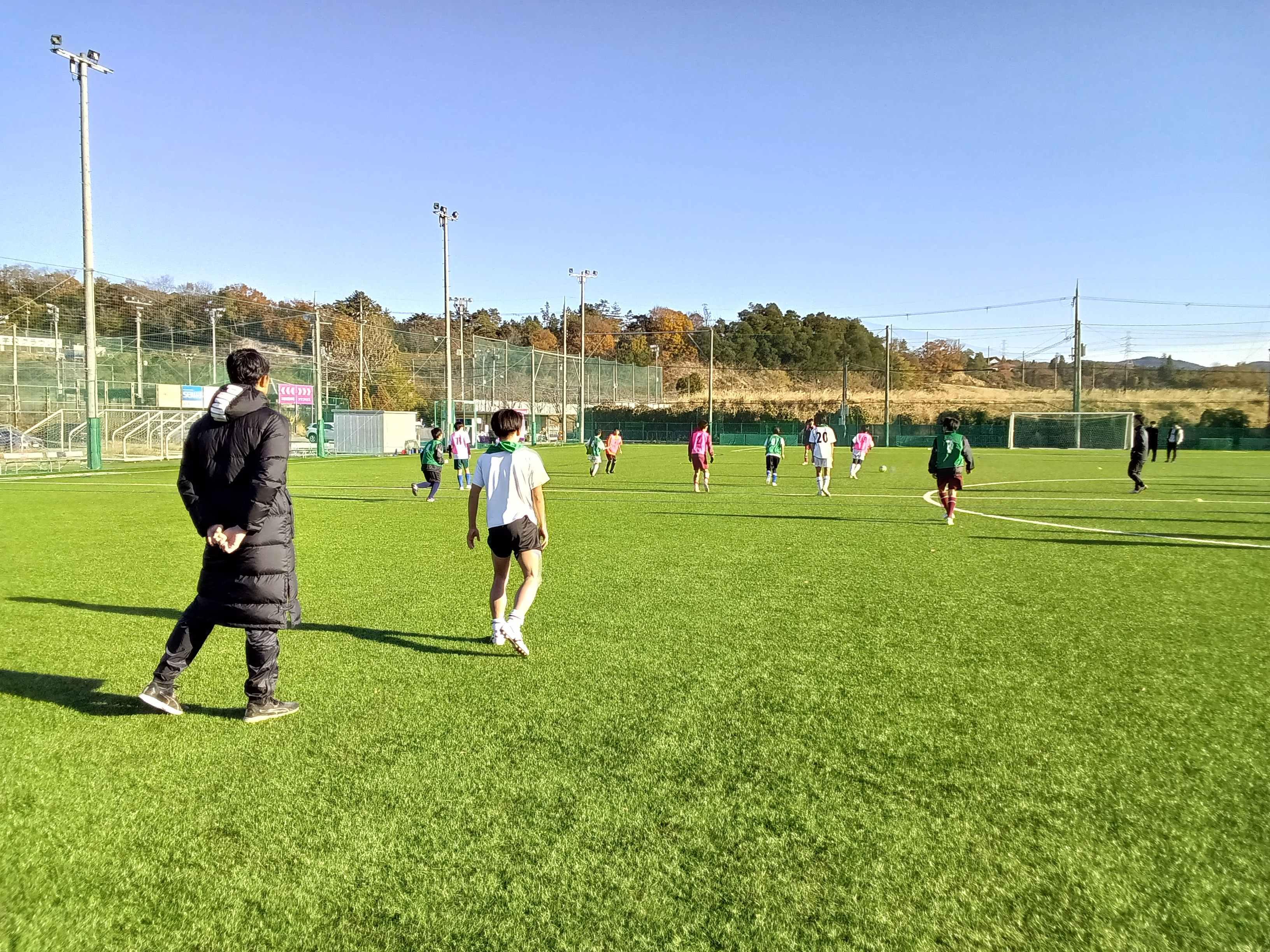 スクールコーチから試合でのパス回しなどを教えてもらい、最後は試合を行いました。その中で、圍選手からゴールキーパー目線でのアドバイスも送られ、中学生は選手からのアドバイスを真剣に聞き、実践にすぐ活かせるように取り組んでいました。