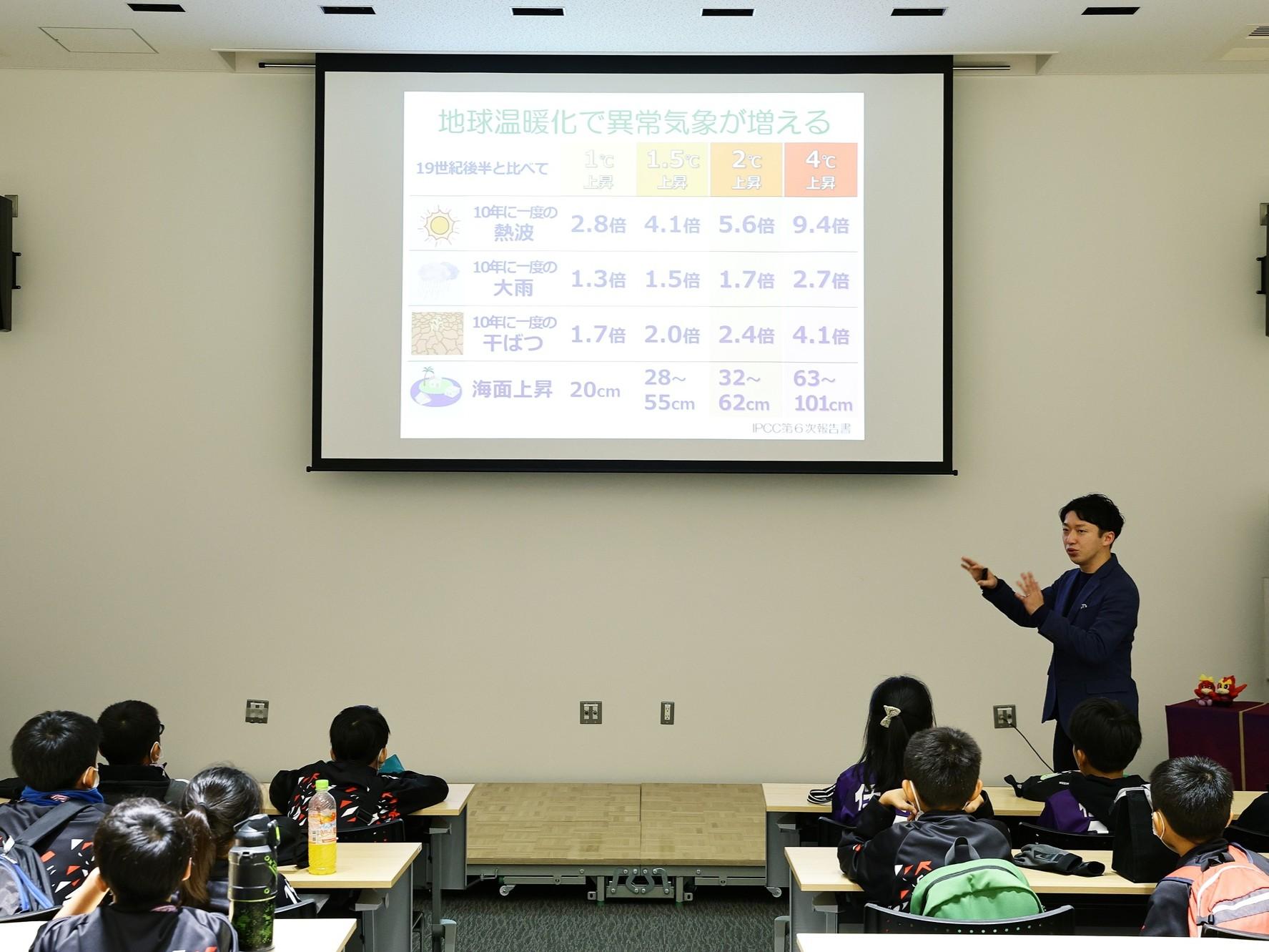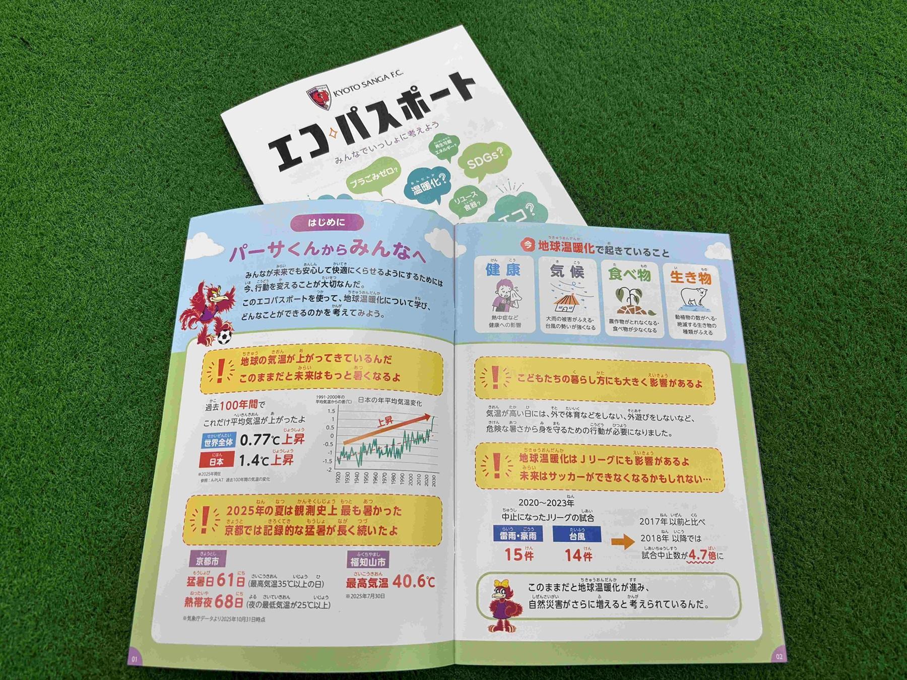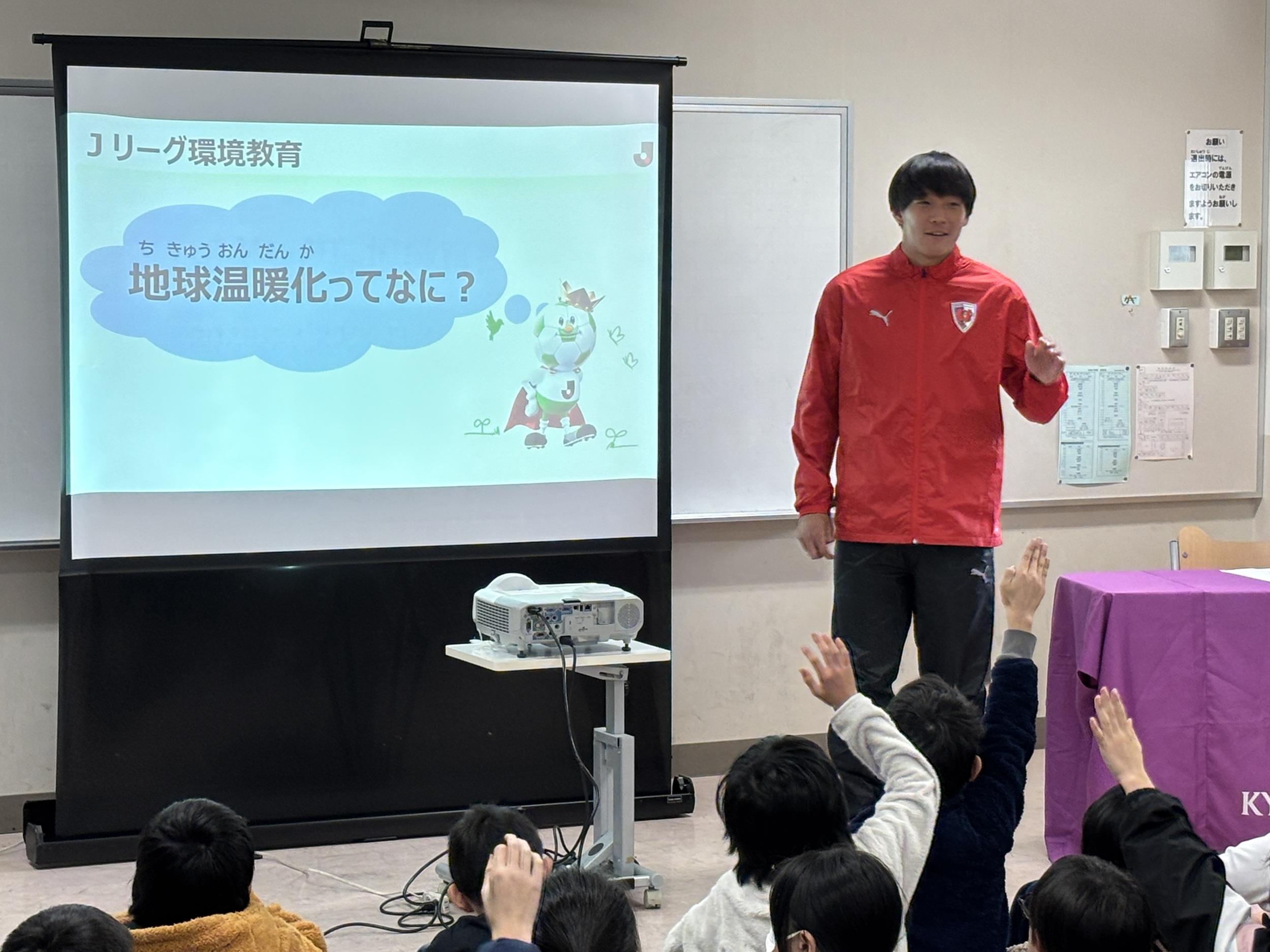 小学生高学年を対象としたオリジナル環境教育教材「エコパスポート」を作成し、現役選手が「Jリーグ気候アクションアンバサダー」として、この教材を活用した府内小学校への出前授業を実施しました。