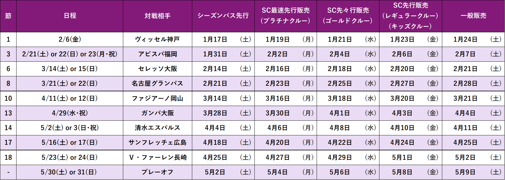 ※第1節ヴィッセル神戸戦・第3節アビスパ福岡戦のみ、販売スケジュールが異なりますのでご注意ください。