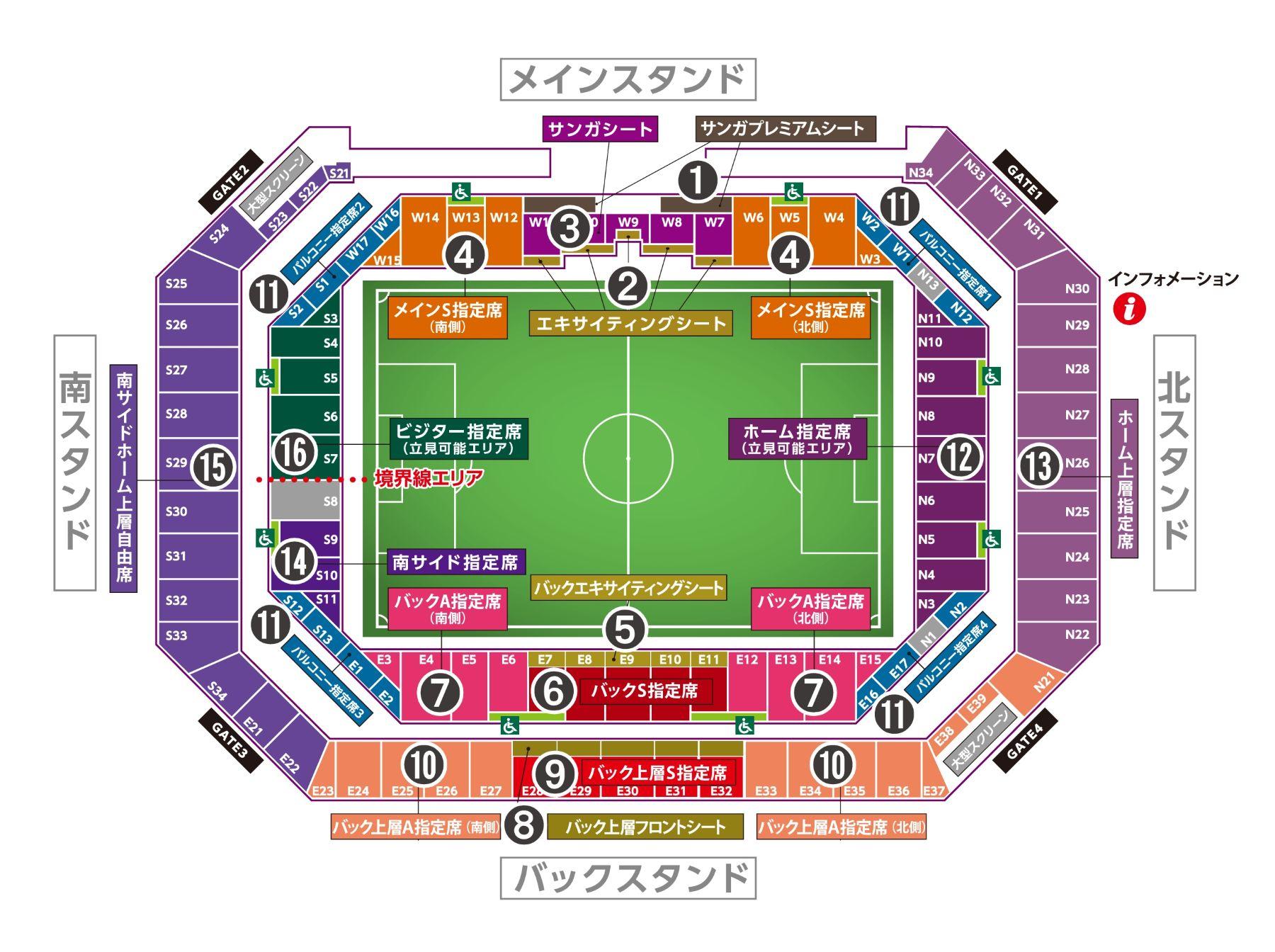 ※ホーム指定席(立見可能)の一部座席(10席程度)を、ホーム側の応援をリードするサポーター連合会用として確保させていただいております。