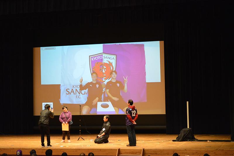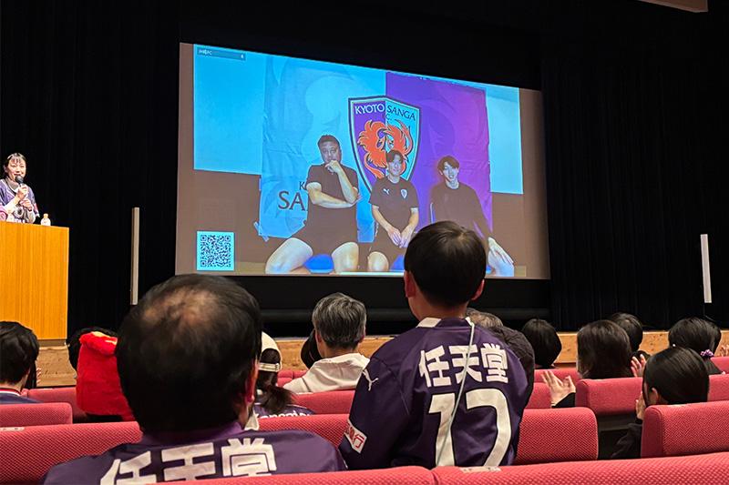 当日は約400名のSANGA CREWの皆さまに京都パルスプラザ・稲盛ホールにお越しいただき、アルミカンのお二人による楽しい司会のもと、離れていても選手とファンが相互に交流する楽しいひと時を過ごしました。