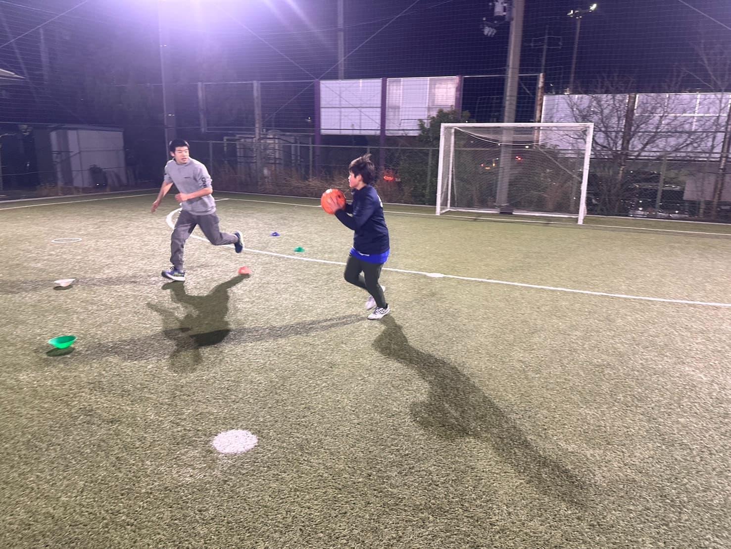 また、チームで協力しながら目的のエリアまでランニング&キャッチでボールを運んで投げ入れるトレーニングを行いました。ボールを持って走ること、移動しながら仲間や目標に向かって投げることで、手でボールを扱う物体操作と身体操作を合わせたトレーニングになります。相手が動く場所が様々なので、周りをよく見て判断することが重要になります。