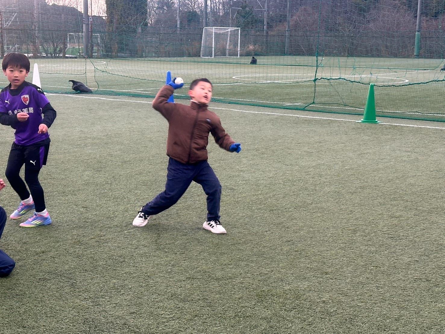 遠くにボールを投げるトレーニングを行いました。腕だけではなく全身をうまく使うことでボールに力が伝わり、遠くにボールを投げることができます。力をかける方向を調整しないと、遠くに飛ばないため、子どもたちは試行錯誤しながら何度もチャレンジしていました。