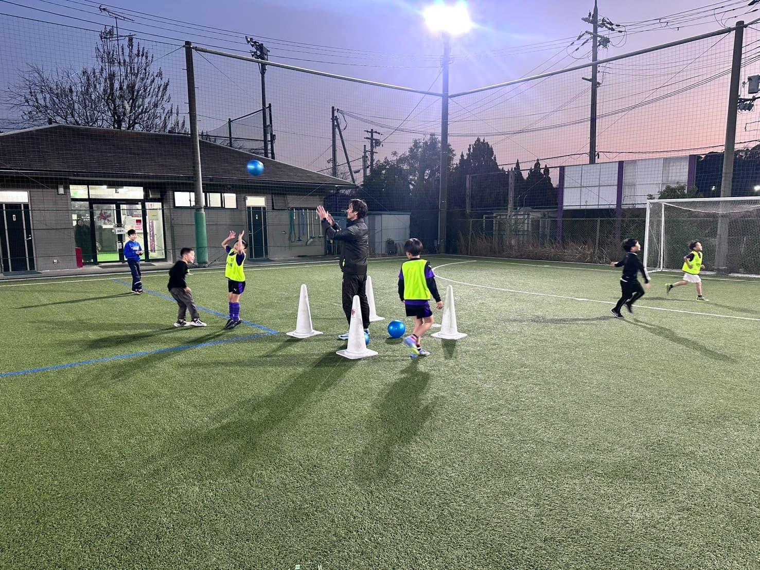 この二つの能力を合わせ、バスケットボールのパスワークのように、走りながらパスして進んでいくトレーニングを行いました。自分も相手も動いているため、パスを出す場所やコントロール力が重要になります。一定距離を進むのに可能なパスの回数を制限するなど、子どもたちは様々な条件でのトレーニングにチャレンジしました。