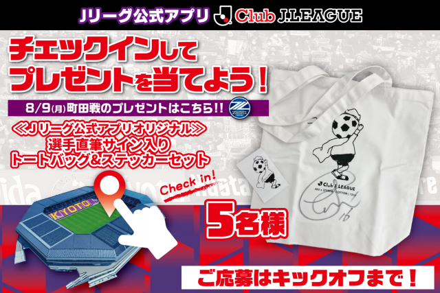 【8/9(月・休)町田戦】選手直筆サイン入りトートバッグ&ステッカーセットが当たる!チェックインキャンペーン開催!