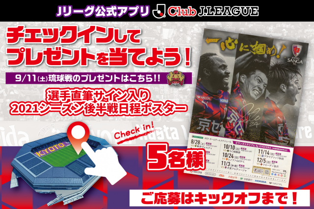試合当日 サンガスタジアム by KYOCERAに到着後、Jリーグ公式アプリ「Club J.LEAGUE」にてチェックインをお願いします。その後、キャンペーン応募ページが出てきますので、ご応募ください。 ※チェックイン時は位置情報オン設定が必要となります。 |