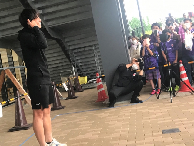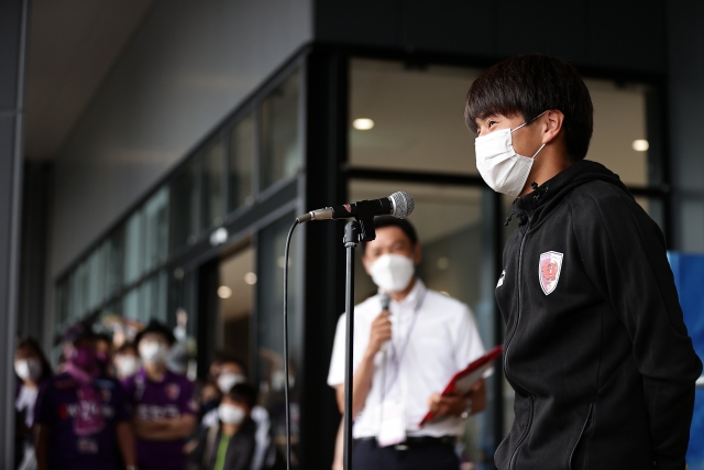 「京都の皆さんにサッカーの魅力を伝えるためにも世界に出て活躍したい」と話し、大きな拍手が沸き起こっていました。