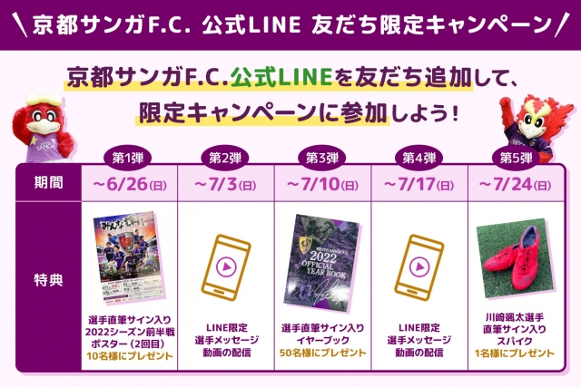 試合・チケット情報や各種キャンペーン情報などがGETできる「京都サンガF.C.公式LINE」をぜひ友だち追加いただき、キャンペーンへのご応募お待ちしております!