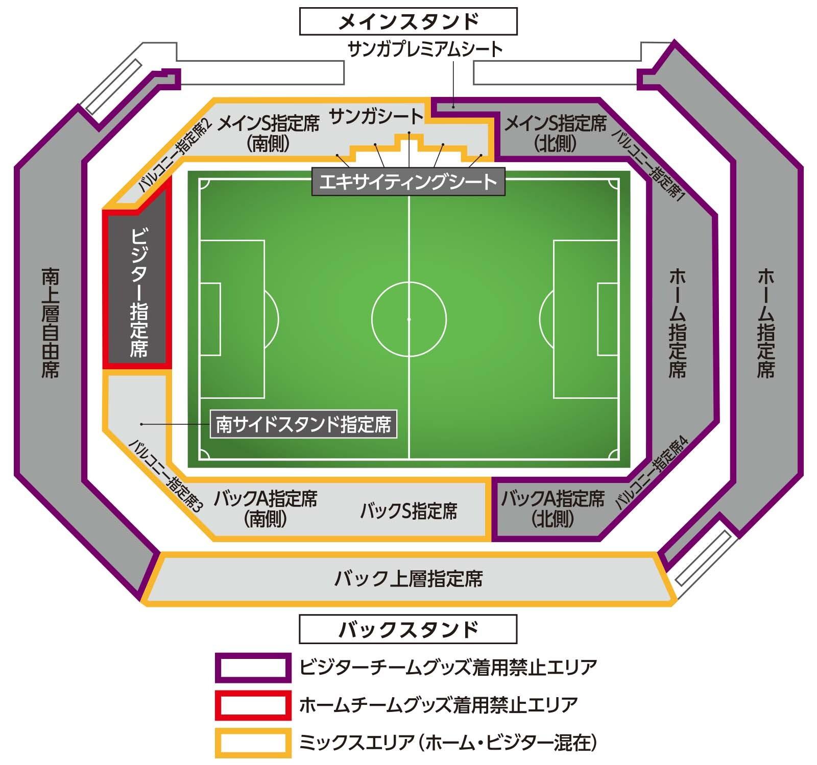 サンガプレミアムシート、メインS指定席(北側)、バックA指定席(北側)、バルコニー指定席1・4、南上層自由席、ホーム指定席ではビジターグッズの持ち込みや応援はできません。ビジター指定席ではサンガグッズの持ち込みや応援はできません。