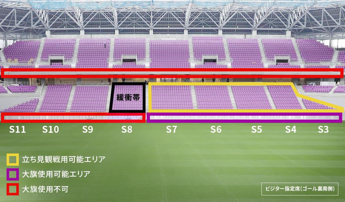 サンガプレミアムシート、メインS指定席(北側)、バックA指定席(北側)、バルコニー指定席1・4、南上層自由席、ホーム指定席ではビジターグッズの持ち込みや応援はできません。ビジター指定席ではサンガグッズの持ち込みや応援はできません。
