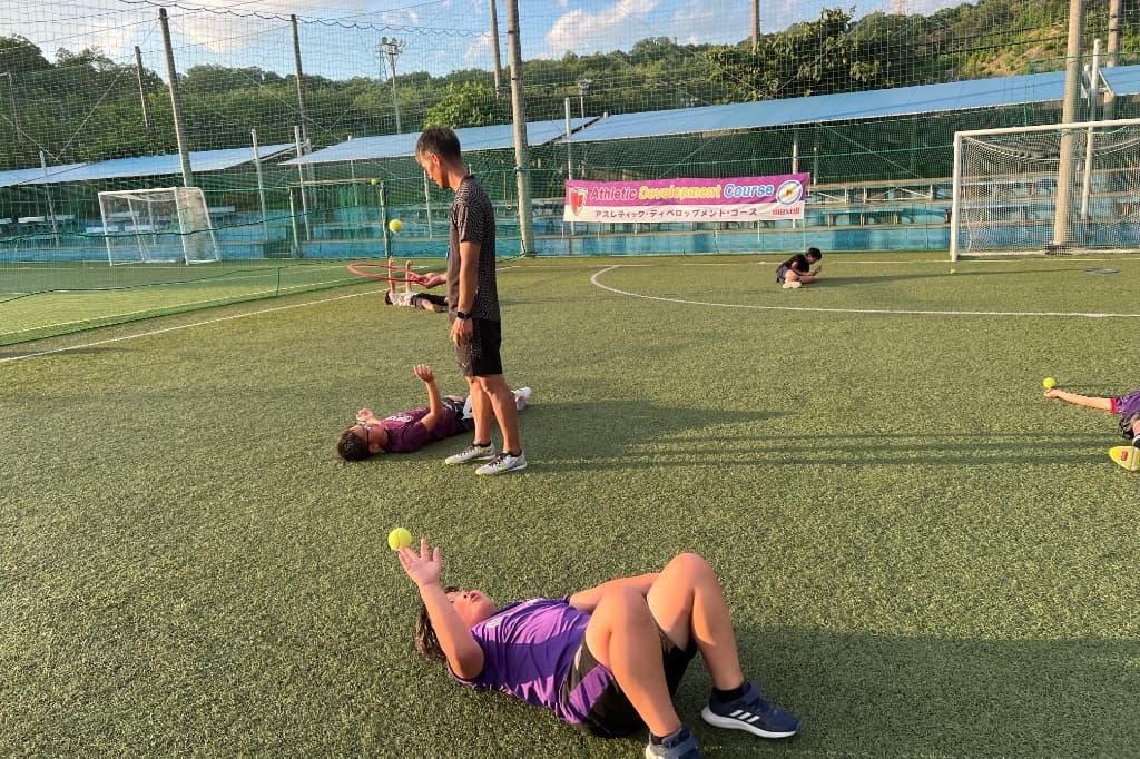 狙い通りに投げることをテーマに、身体の向きや手首の使い方を練習しました。寝ながら投げる練習では、手首を上手く使わないとボールが真上にはいかないので、手首をしなやかに動かすことや、ボールを離すタイミングに注意しながら練習を行いました。子どもたちや保護者からは「家でもできるのでやってみよう」という声もありました。
