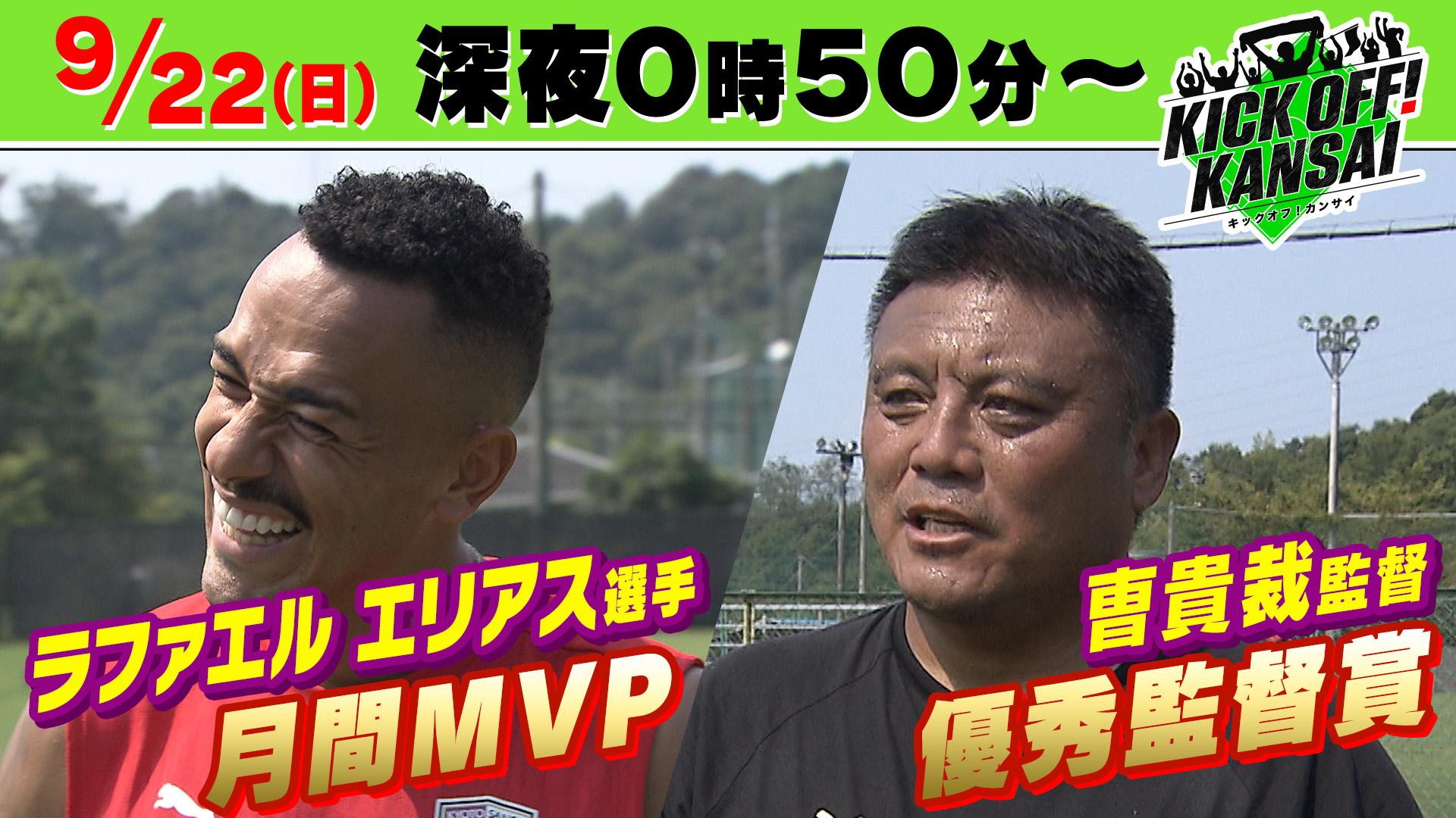 9月22日(日・祝)深夜に毎日放送で放送される「KICK OFF! KANSAI」に、曺貴裁監督、ラファエル・エリアス選手が登場しますので、お知らせいたします。