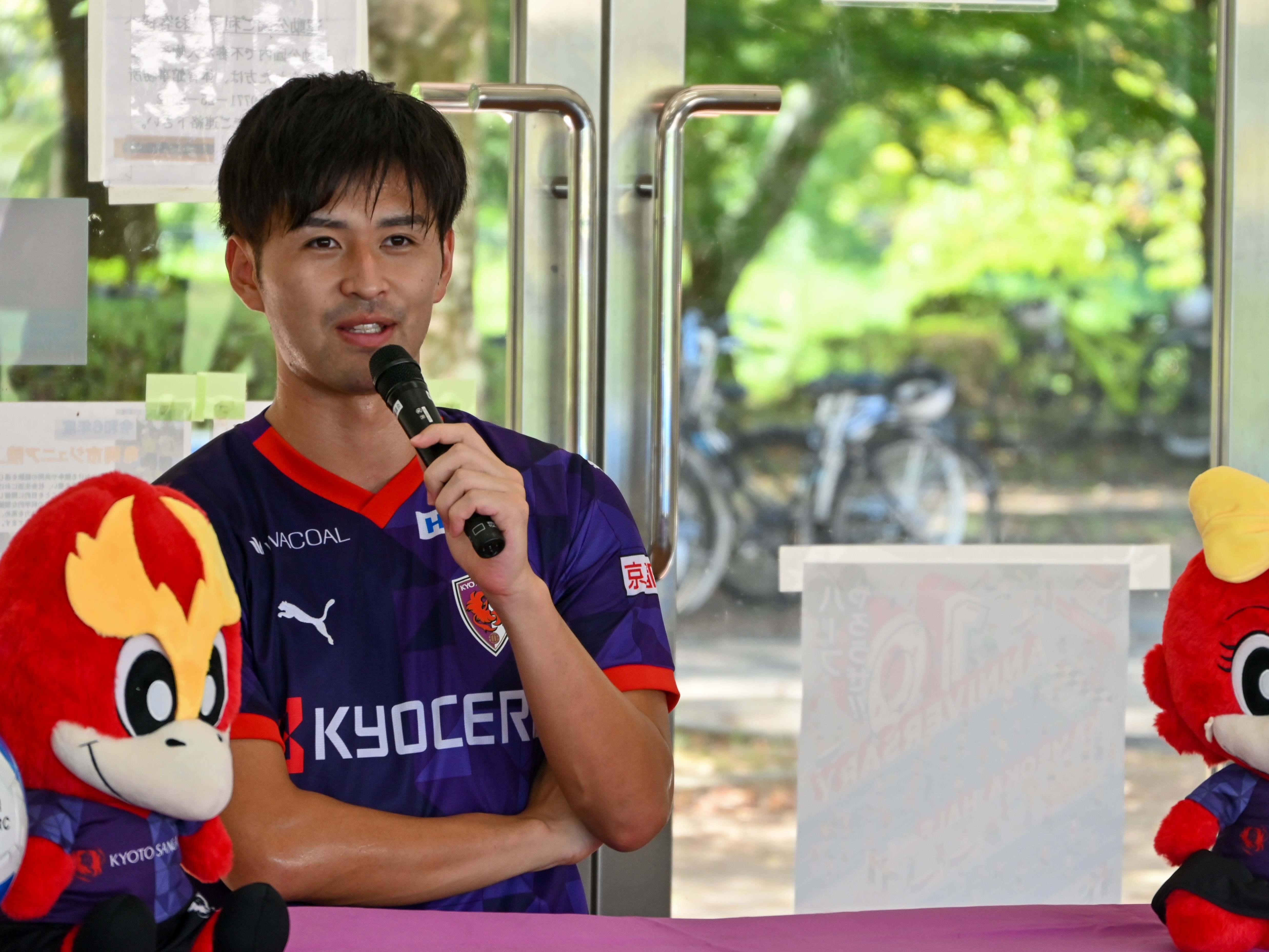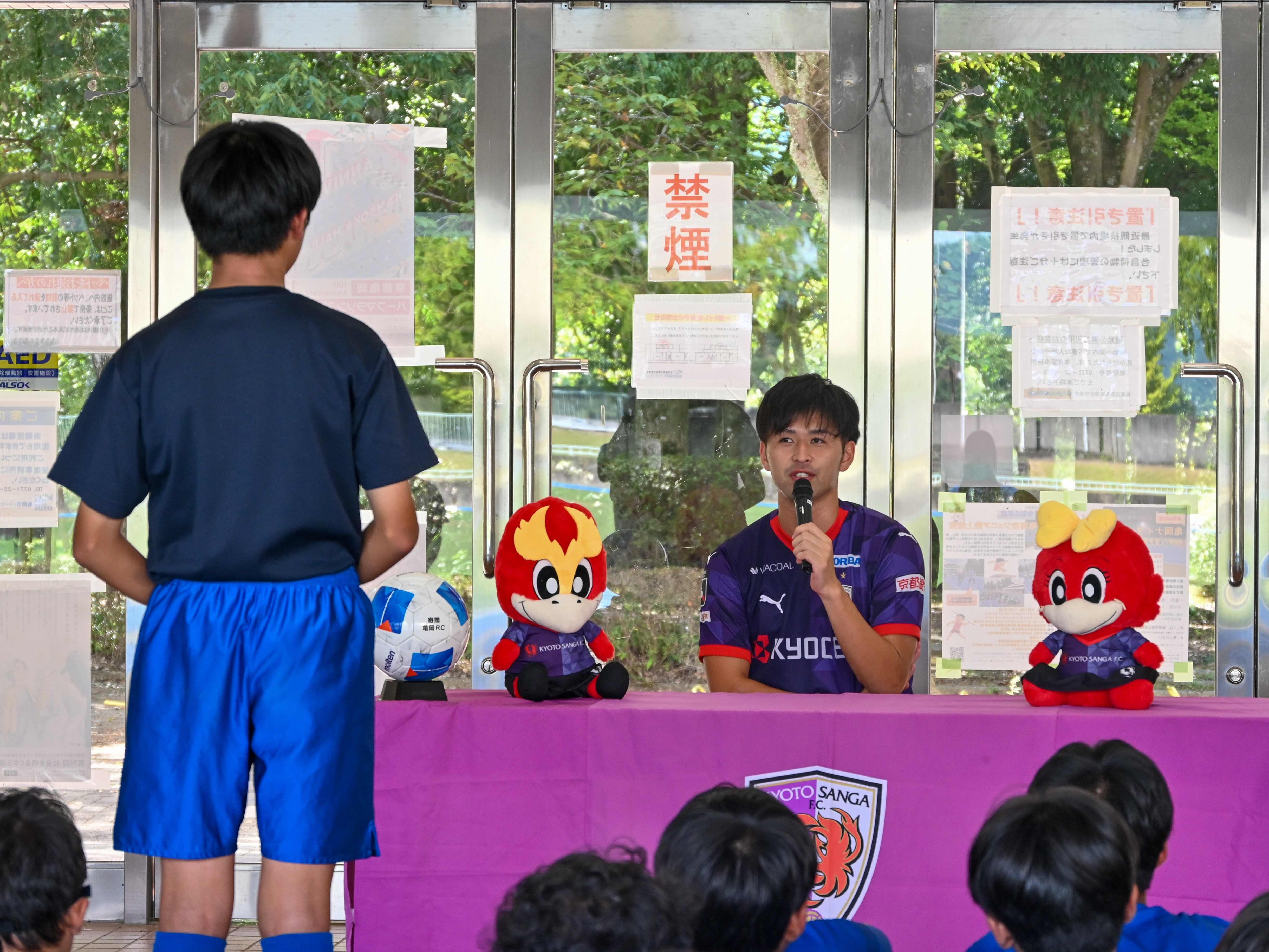 このイベントでは、亀岡市内の中学校サッカー部及びクラブチームによる交流試合などが行われ、特別ゲストとして麻田選手が出演しました。