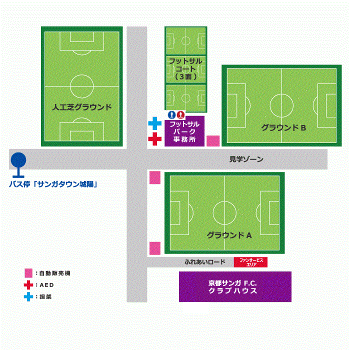 サンガタウン城陽の駐車場には限りがあり、各種イベント参加者やフットサル利用者の駐車場所を確保する必要があることから、練習見学およびファンサービスにお越しいただく場合は、平日、休日に関わらず駐車場をご利用できません。