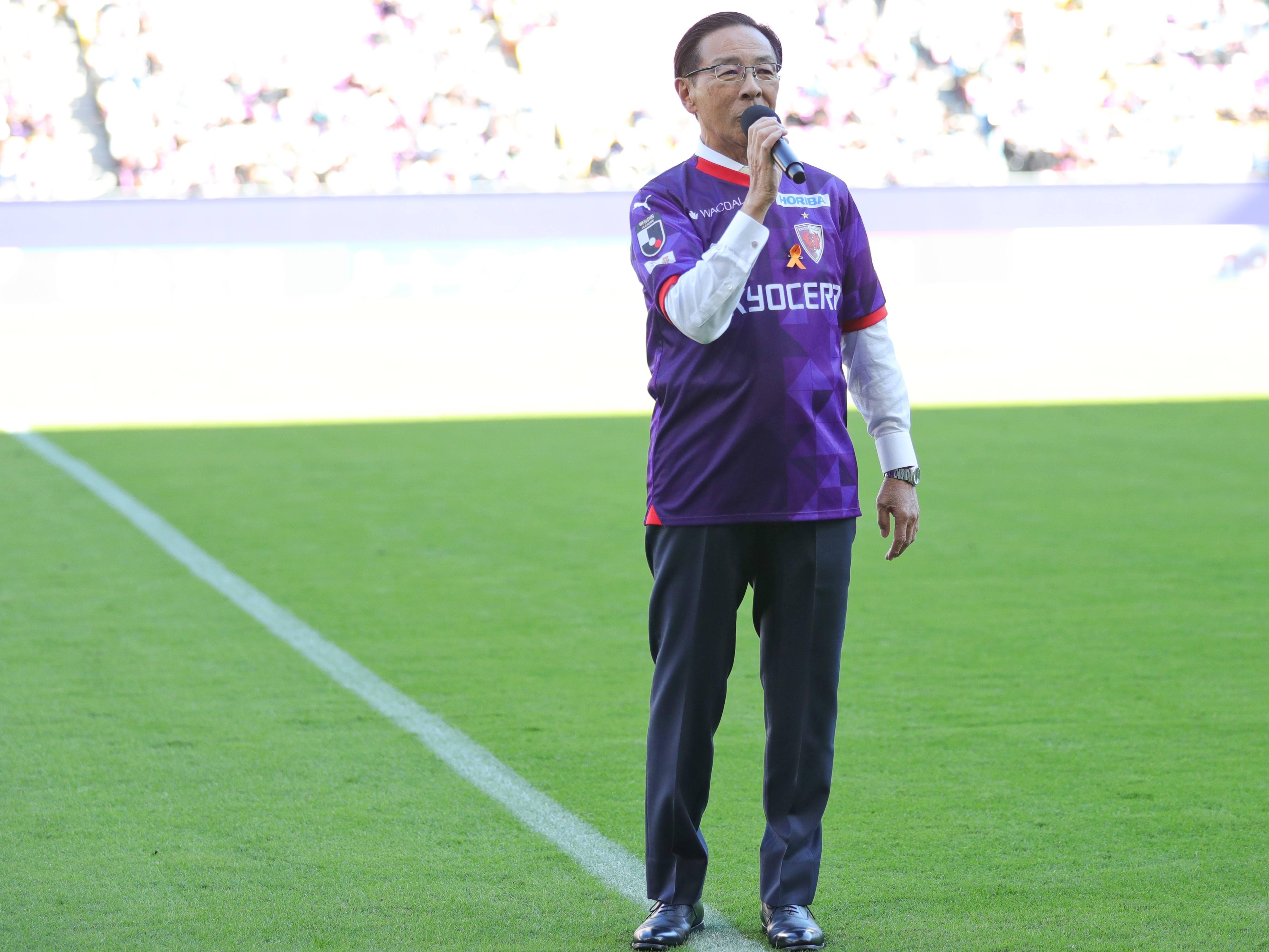 ハーフタイムのピッチでの啓発活動(西脇隆俊 京都府知事)