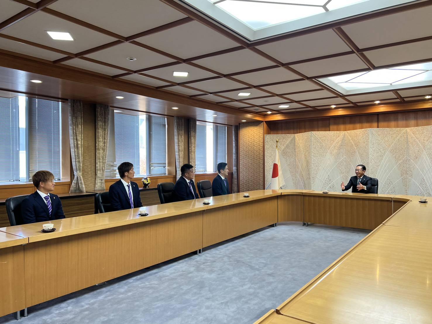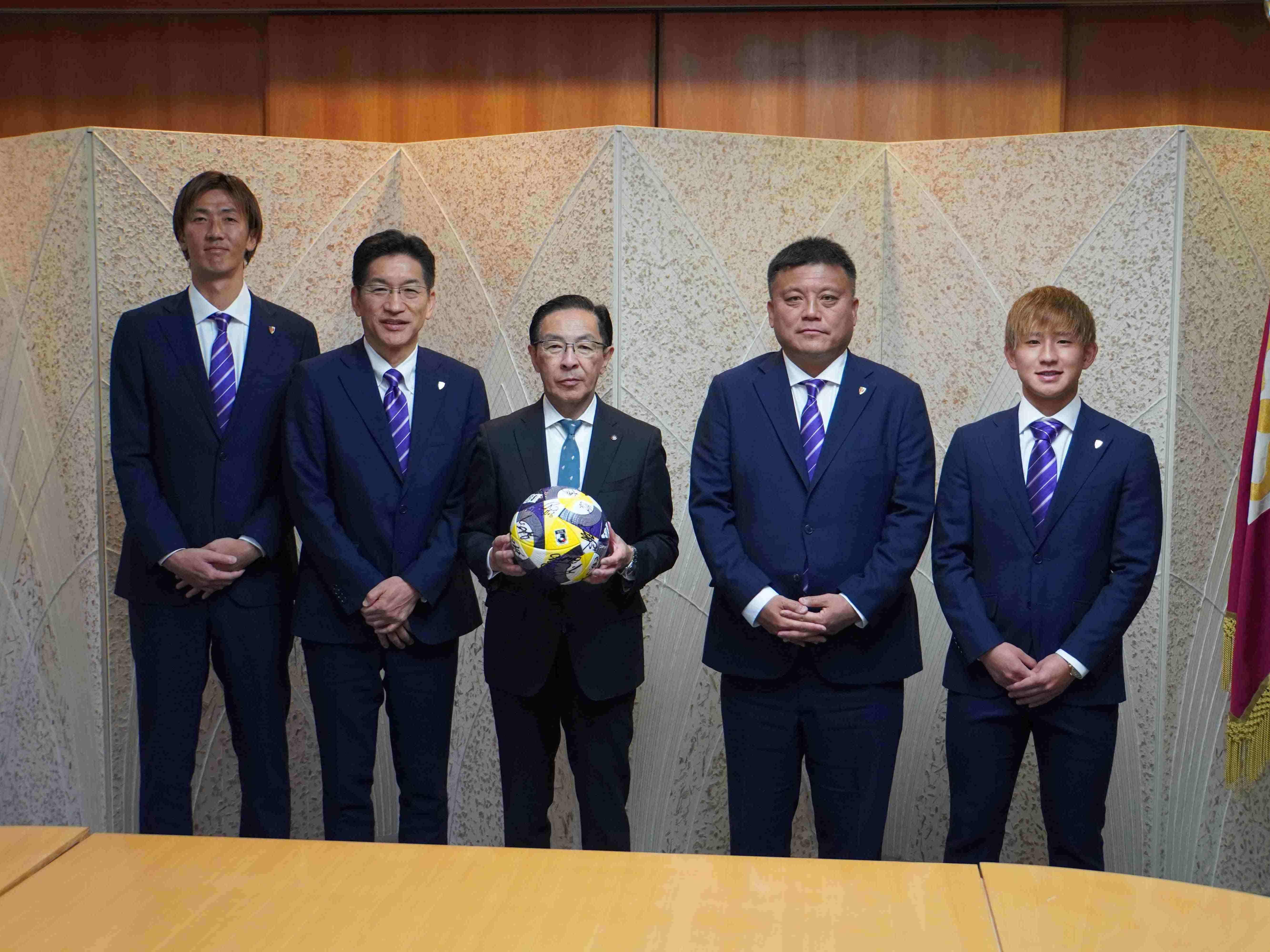 12/10(水)に弊社代表取締役社長の飯野晃と曺貴裁監督そして佐藤響選手と長沢駿選手が京都府庁を、12/8(月)に弊社代表取締役社長の飯野晃と曺貴裁監督そして宮本優太選手と鈴木義宜選手が京都市役所を訪問し、2025シーズン終了の報告と1年間のサポートのお礼を行いました。