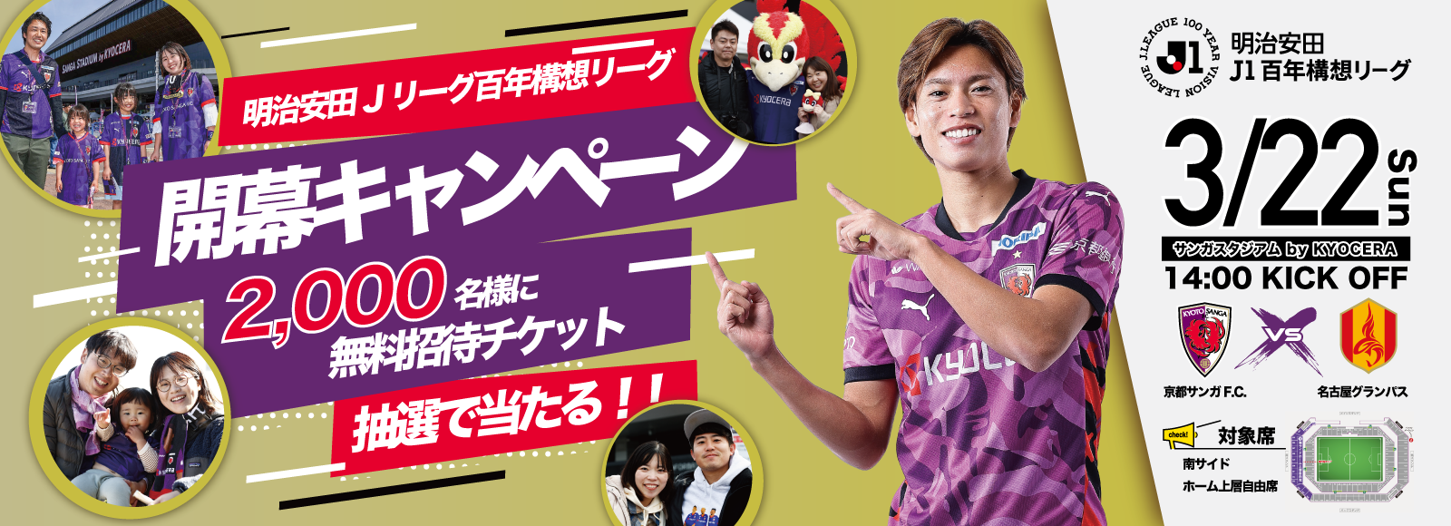 Jリーグが開催する「明治安田Jリーグ百年構想リーグ 開幕キャンペーン」の一環として、京都サンガF.C.では3月22日(日)名古屋グランパス戦を無料でご観戦いただける招待チケットが抽選で2,000名様に当たる特別企画を実施いたします。