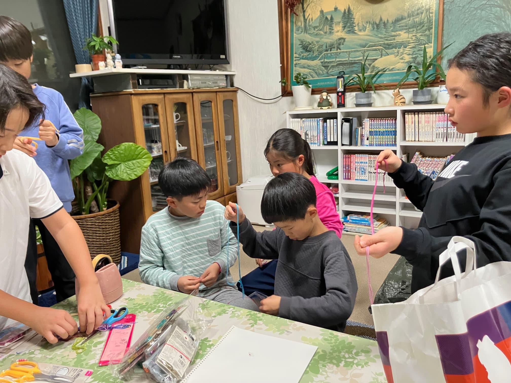 宿泊先に戻ると、初日とは別のグループが運営を担当してキャンプの思い出となるミサンガを作りました。サンガの紫色を基調に、それぞれが選んだ色を組み合わせ、互いに教え合いながらオリジナルミサンガを完成させました。今回のウィンターキャンプの思い出としてだけでなく、仲間と関わる中で学びと成長を感じられる、温かい時間となりました。