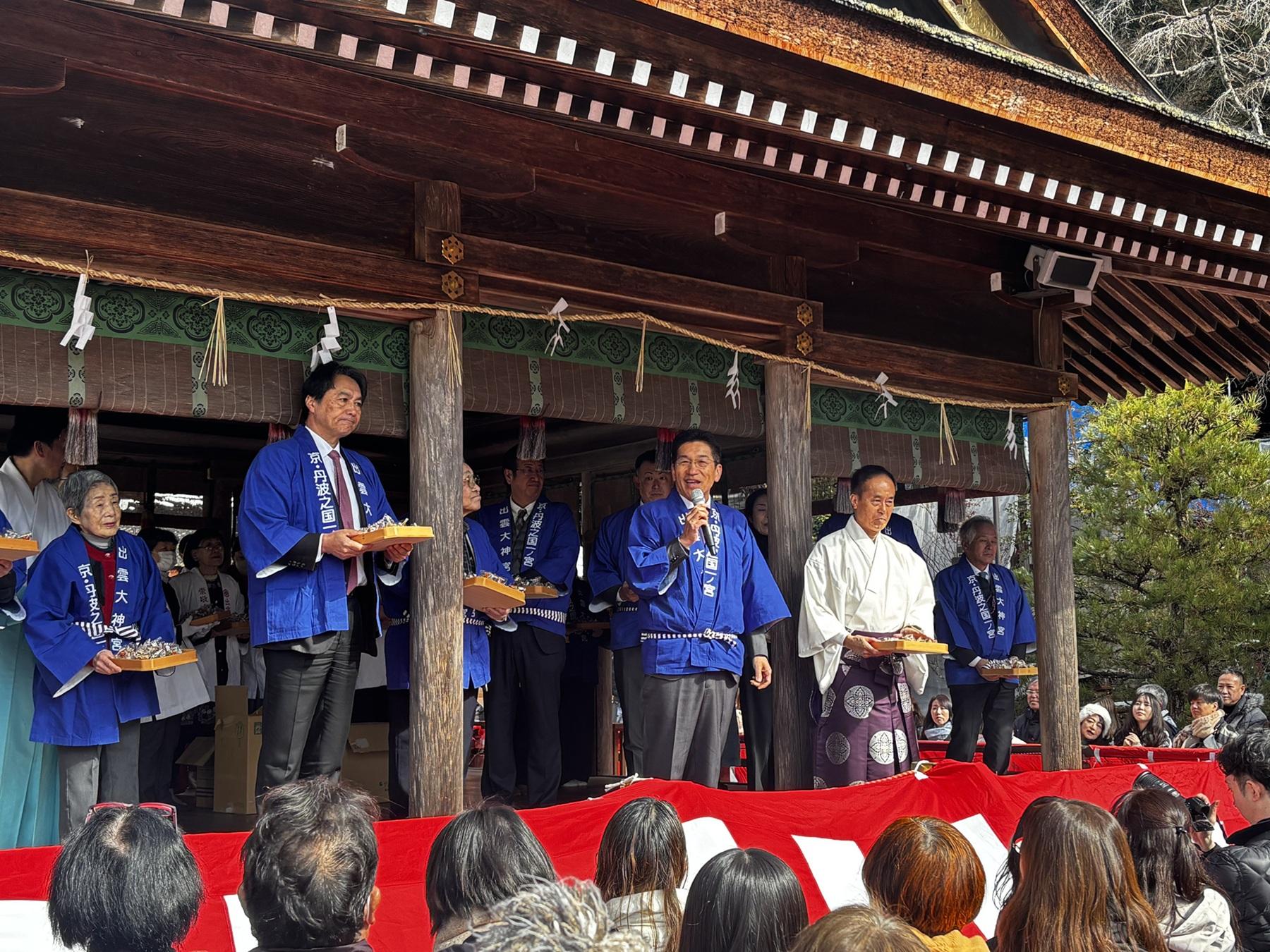 飯野は、本殿で執り行われた節分祭祭典に参列したのち、年男・年女の皆様とともに福豆まき神事に参加し、参加者の皆様に日頃のご支援への感謝と今シーズンへの想いを述べ、皆様の無病息災や開運招福を願いながら豆まきを行いました。