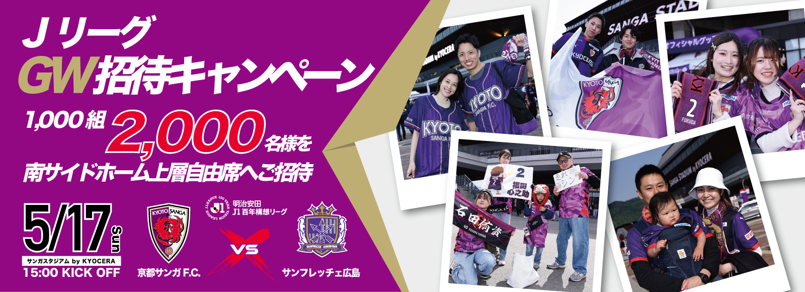 Jリーグが開催する「JリーグGW招待キャンペーン」の一環として、京都サンガF.C.では5月17日(日)サンフレッチェ広島戦を抽選で1,000組2,000名様を特別ご招待いたします。