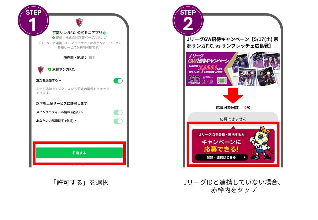 ・本キャンペーンに応募いただくと、JリーグIDのお気に入りクラブに自動的に京都サンガF.C.が追加され、京都サンガF.C.からのお知らせを受信します。