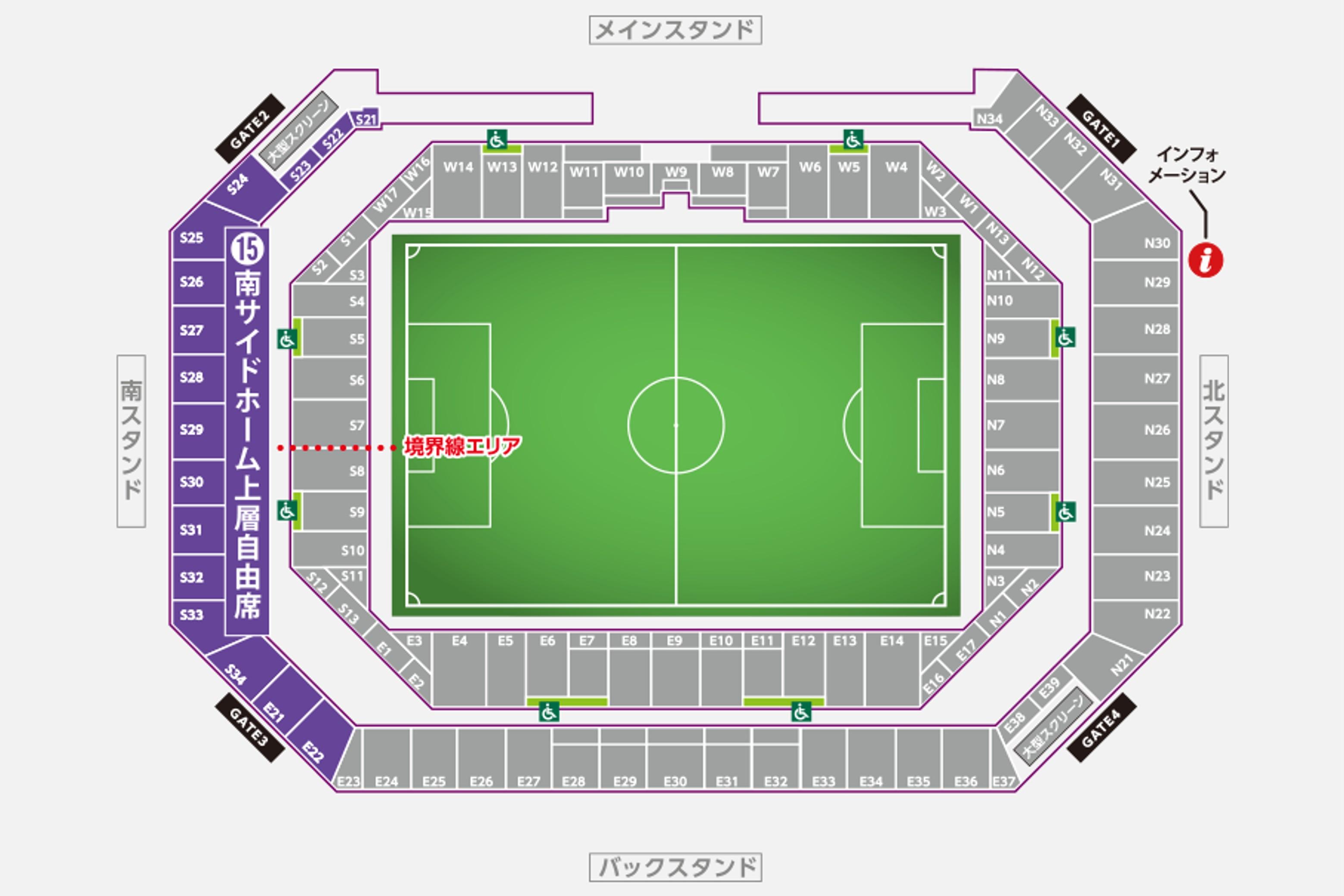 ※南サイドホーム上層自由席はビジターグッズの着用不可エリアですのでご注意ください。
